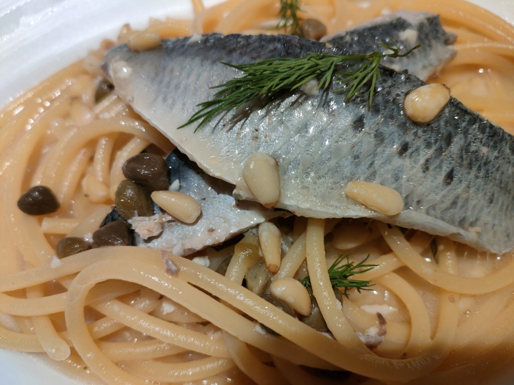 北海道釧路産の大鵬鰯と松の実のパスタ。